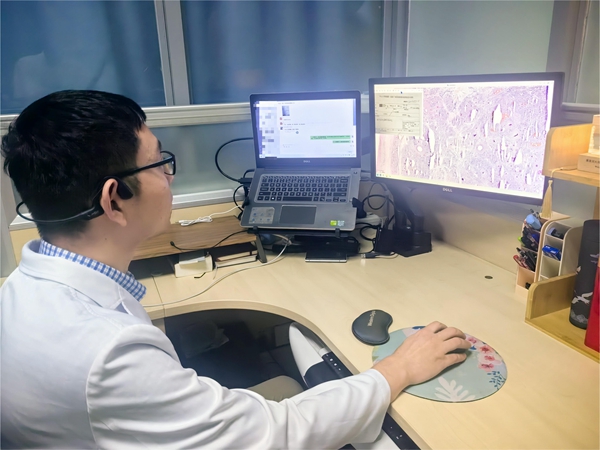 待这一流水线式的操作完成后,病理科技师通过切片扫描仪将病理切片扫描,中山大学附属第一医院病理科专家刘大伟教授在广州本部通过互联网远程访问数字化切片,迅速对病理切片进行分析诊断。