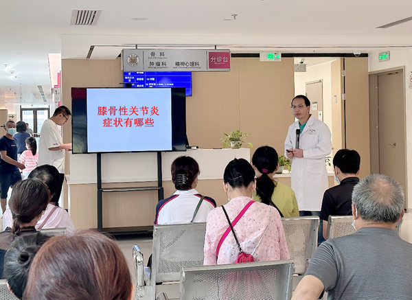 在讲座现场,骨科负责人李书振主任医师用通俗易懂的语言,图文并茂的方式,详细为大家讲解了骨关节炎的概念、易患人群、诱发因素、临床表现及治疗方法。李书振表示,骨关节炎是中老年群体的高发病,其中退行性膝骨关节炎尤为常见。骨关节炎好发于中老年人群,且发病率高,65岁以上人群中50%以上患有骨关节炎,发病率女性高于男性。因此,骨关节相关知识的普及尤为必要,科室也将定期举办健康义诊和科普宣教活动,为大家普及更多关于骨关节炎的知识,切实为群众做好医疗服务。