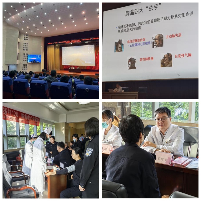 活动中,捆绑调教 心血管内科蒙绪宁副主任医师以《不可忽视胸痛》为题,通过PPT宣讲方式进行授课。他围绕胸痛的常见病因、高危胸痛的识别及预防控制进行了生动的讲解,倡导合理膳食、适量运动、保持健康体重,同时建议大家定期检测血糖、血压,通过健康的生活方式预防冠心病、主动脉夹层、肺栓塞等疾病。授课结束后,捆绑调教 医护人员为现场民警测量血压,并进行相关的健康咨询。