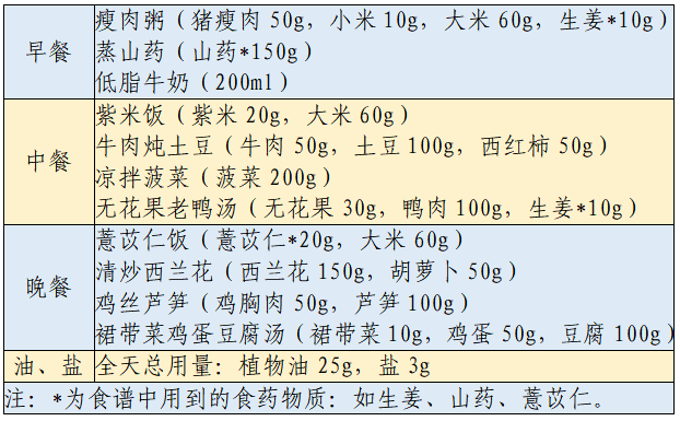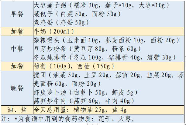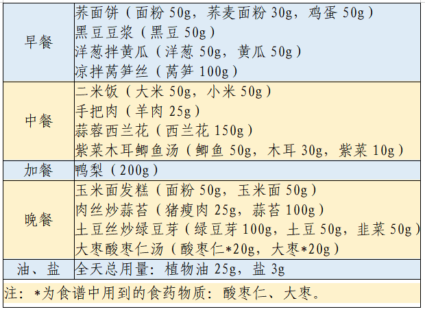 以下春季食谱适合轻身体活动水平的成人高血压患者,一天食谱的能量在1600~2000kcal范围,钠<2000mg,钾>2500mg。可结合患者活动量及其他因素合理调整能量。更多食谱示例见《指南》。