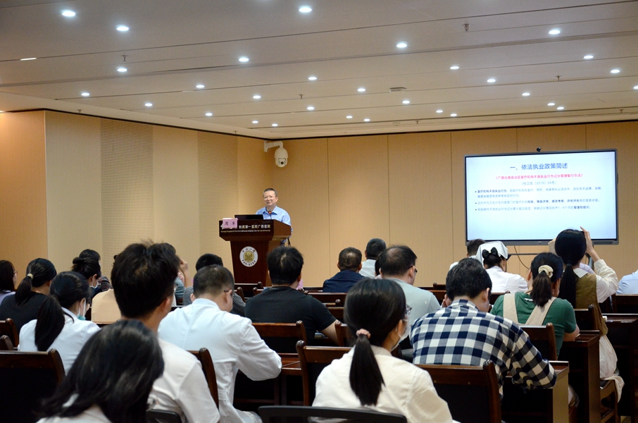 冯云新从自身多年执法过程中的一些典型案例入手,以案释法,围绕医疗机构及医务人员不良执业行为相关的法律法规、规章制度,记分标准、记分规则为大家进行了详细阐述,并就如何增强医务人员执业意识、规范执业言行、科室如何更好的开展依法执业自查工作等内容进行授课。