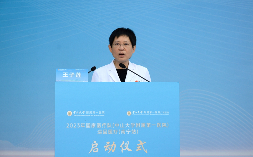 此次中山一院国家医疗队来到广西南宁,将更好地推动优质医疗资源向人民群众身边延伸,帮助提高医务人员技术水平以及医院综合服务能力,有效减少跨省份、跨区域看病就医,不断增强人民群众的就医获得感、幸福感和安全感,让粤桂人民的心贴得更近。她希望国家医疗队队员们能出色地完成任务,把中山一院先进的理念、规范的诊疗体系、尖端的技术毫无保留地带到南宁、留在南宁,为粤桂一家亲作出贡献,为健康广西、健康中国建设贡献中山医智慧和力量。
