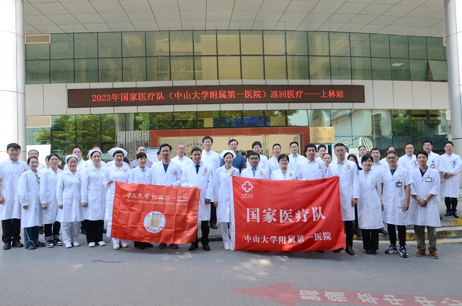 根据《国家卫生健康委办公厅关于开展2023年国家医疗队巡回医疗工作的通知》(国卫办医政函〔2023〕179号)文件精神,为贯彻落实党中央、国务院关于巩固拓展脱贫攻坚成果同乡村振兴有效衔接的工作要求,持续促进优质医疗资源有效下沉,国家卫生健康委决定以医疗服务能力薄弱地区为重点,组织2023年国家医疗队赴相关地区开展巡回医疗工作。中山大学附属第一医院接到此项任务后,院领导高度重视,根据广西壮族自治区卫生健康委、南宁市卫生健康委、上林县人民医院提出的帮扶需求,最终选出一支由中山大学附属第一医院神经内科、放射科、妇产科、泌尿外科、血液内科、骨科、心血管内科9名医护专家组成的国家医疗队,赴上林开展为期一个月的巡回医疗工作。