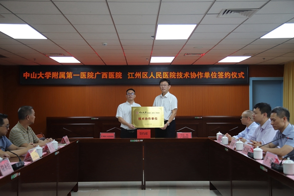 李健与陈新艺代表两院在会上进行签约,李健向江州区人民医院颁发技术协作单位牌匾。仪式后双方进行技术协作单位揭牌及合影留念。