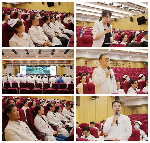 为庆祝中国共产党成立104周年,深入贯彻中央八项规定精神学习教育,涵养清正医德医风,6月30日,中山大学附属第一医院(简称中山一院)广西医院在八月会议中心举行庆祝中国共产党成立104周年大会暨第一期道德讲堂活动。医院党委书记张国、执行院长李健等党政领导班子成员,党委委员、纪委委员及各科室中层干部、各党支部和团支部代表等参加活动。