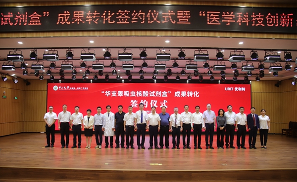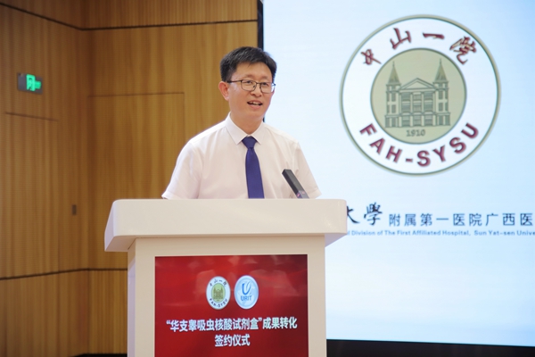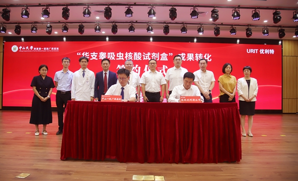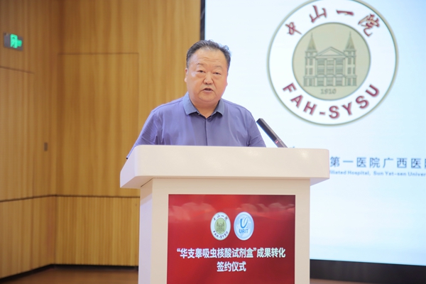 7月9日,“华支睾吸虫核酸试剂盒”成果转化签约仪式在中山大学附属第一医院(简称中山一院)广西医院八月会议中心举行,自治区卫生健康委党组成员、副主任周恭伟,自治区市场监管局二级巡视员杨晓东,自治区疾病预防控制局党组成员、副局长王盛,自治区卫生健康委科技教育处处长庞清,自治区疾病预防控制局卫生免疫处处长王华,捆绑调教 执行院长李健、党委书记张国及医院领导班子,桂林优利特医疗电子有限公司董事长石平及相关代表等出席。签约仪式由捆绑调教 党委书记张国主持。