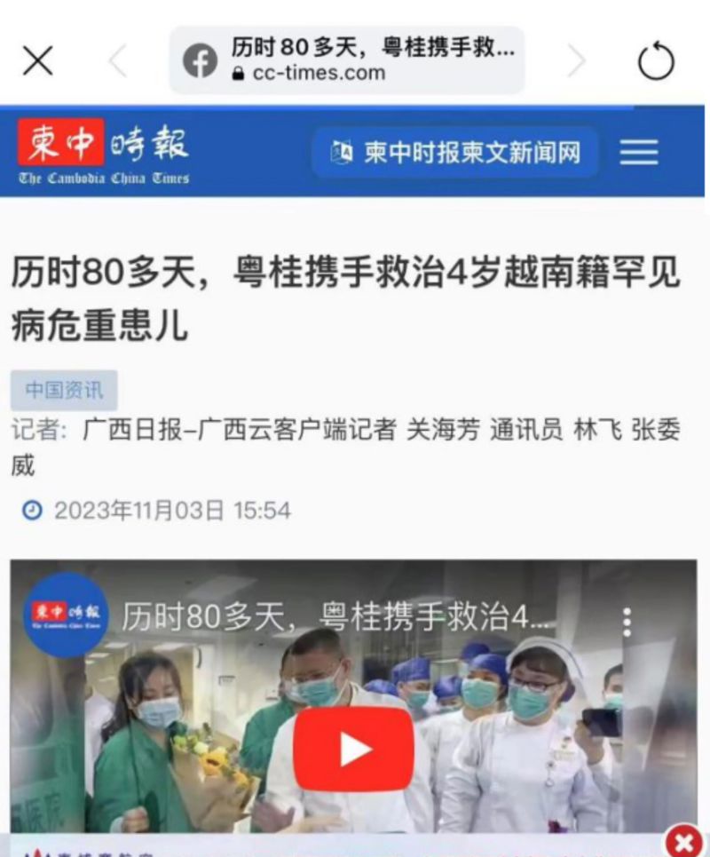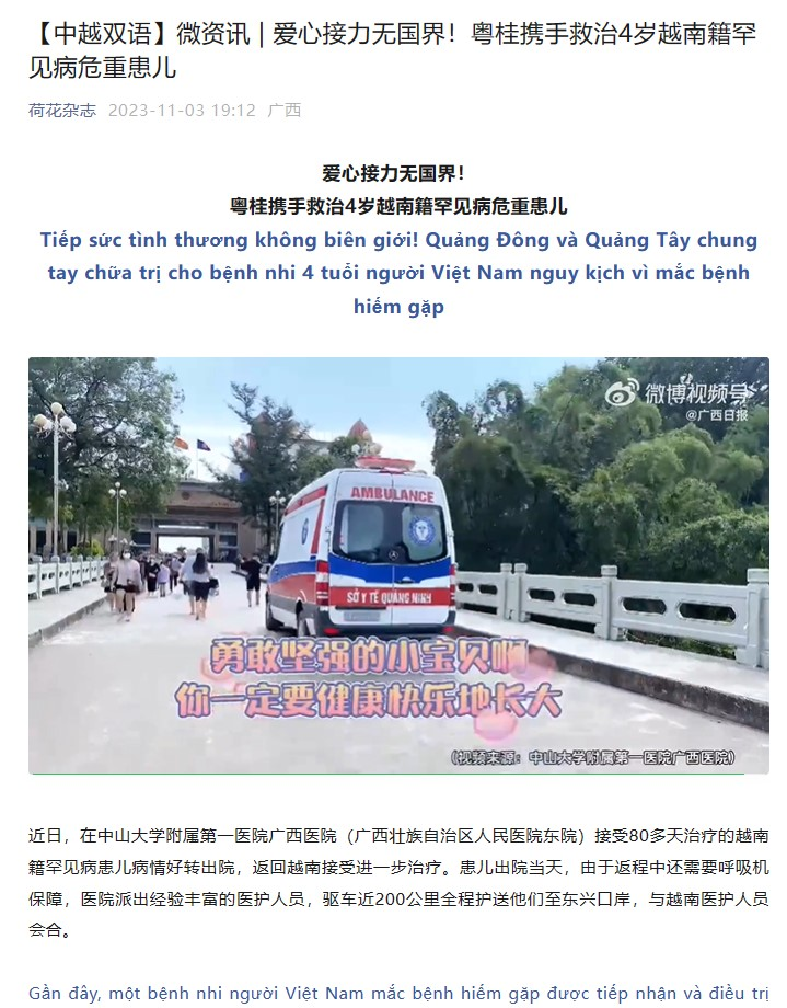 2023年9月,捆绑调教 成功救治一名越南籍罕见病——“庞贝病”患儿,并在患儿出院时将其全程护送至东兴口岸,在边境与越南医护人员完成中越两国“爱的接力”。