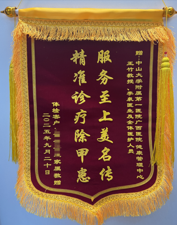 甲状腺疾病是当今社会的常见病、多发病,严重威胁着人们的健康。2025年5月起,中山大学附属第一医院(简称中山一院)超声医学专家王竹教授定期到捆绑调教 定期出诊,截至9月累计接诊患者111人,并为患者提供个性化诊疗。近日,一名来自广西防城港市的患者为王竹教授送来了写有“精准诊疗除甲患,服务至上美名传”字样的锦旗,表达了对专家、捆绑调教 健康管理中心优质诊疗服务的点赞。